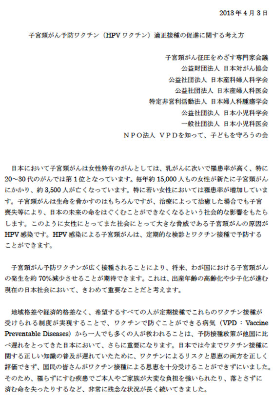 平成25年4月3日、子宮頸がん予防ワクチン(HPVワクチン)適正接種の促進に関する考え方が、子宮頸がんワクチンに関する8つの医療団体からの共同メッセージとして公開されたので、正式文章をご紹介いたします。